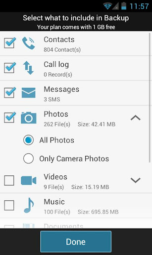 Backup Messages (SMS), contacts, call logs, documents, photos, videos