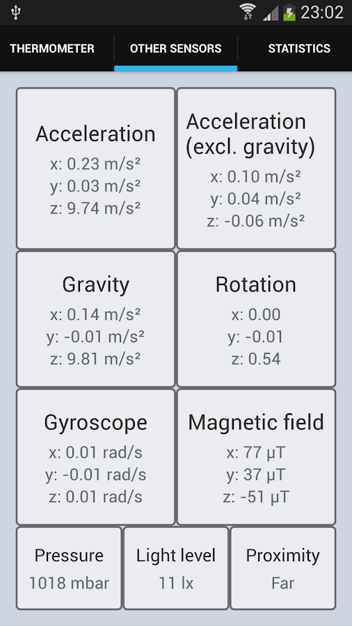 In addition, all sensors data: Acceleration, Gravity, Rotation, Gyroscope, Magnetic field, Pressure, Light level, and Proximity.